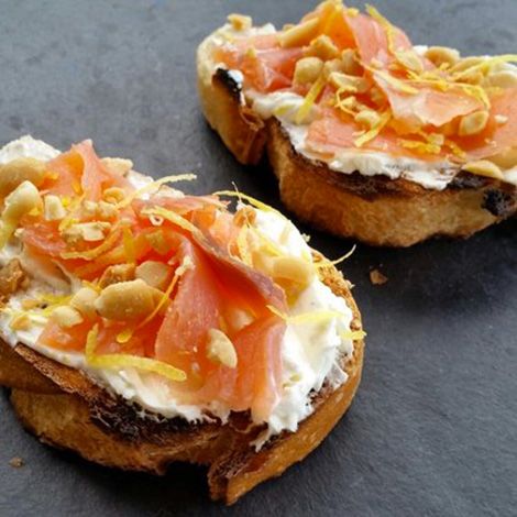 Prendre une tranche de Pain complet - céréales ou pain tout court, Tartiner du fromage frais dessus, Puis placer la tranche de saumon entière ou découper.